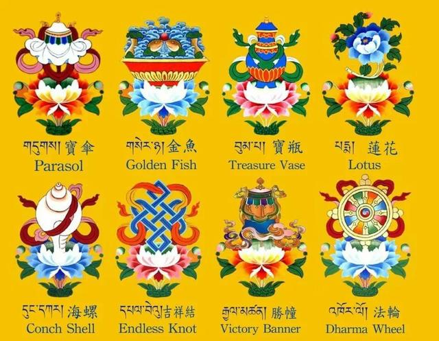 “佛教八寶”亦稱“吉祥八寶”或“八吉祥”或“八瑞相”等,即“輪螺傘蓋花罐魚長(zhǎng)”,展開來(lái)就是法輪、法螺、寶傘、白蓋、蓮花、寶瓶(罐)、金魚(雙魚)、盤長(zhǎng)(吉祥結(jié))。